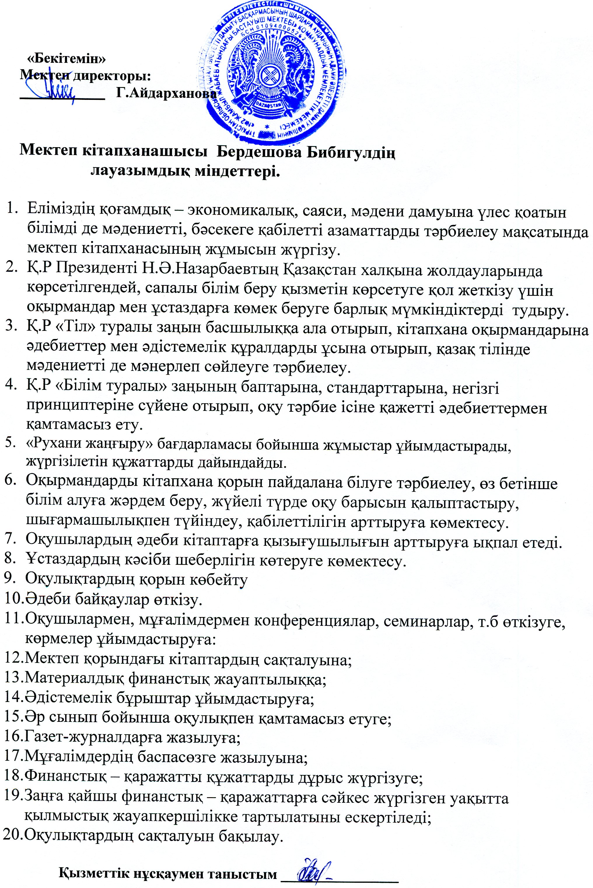 Кітапханашының лауазымдық міндеттері